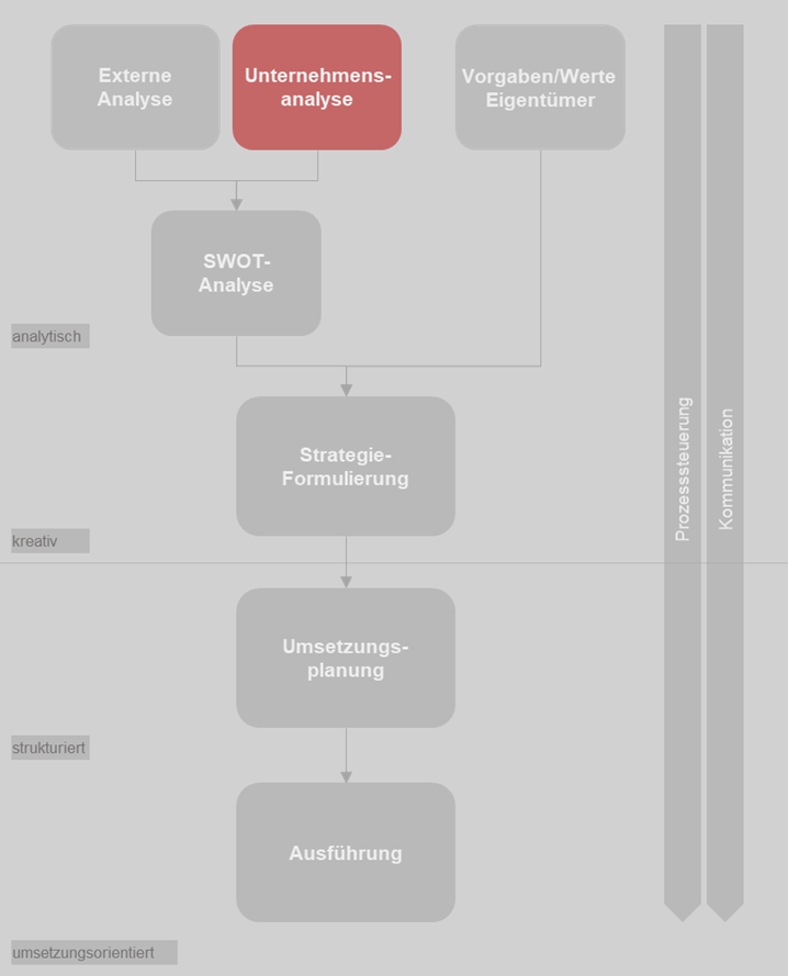 Der vierte Teil der Serie zur Strategieentwicklung befasst sich mit der Unternehmensanalyse (rot in der Grafik unten). Sie dient dazu, die Stärken und Schwächen des Unternehmens zu identifizieren.